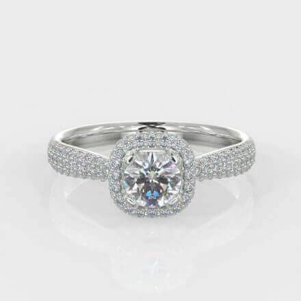 The centre diamond is 0.50 carats Round Brilliant cut with G colour, S12 in clarity and IGI certified. Surrounding the centre stone is a halo of small round cut diamonds pave style set.